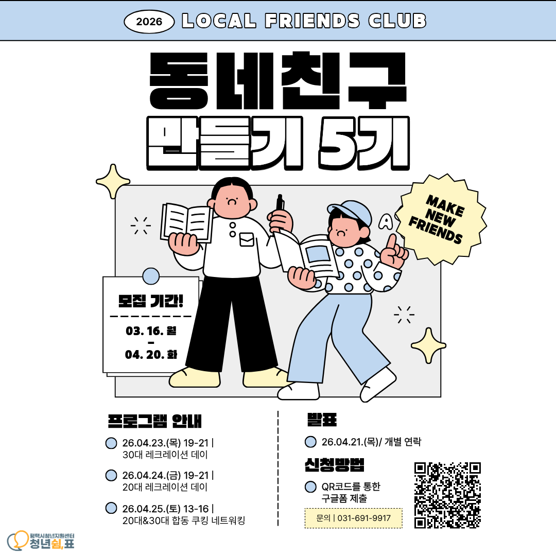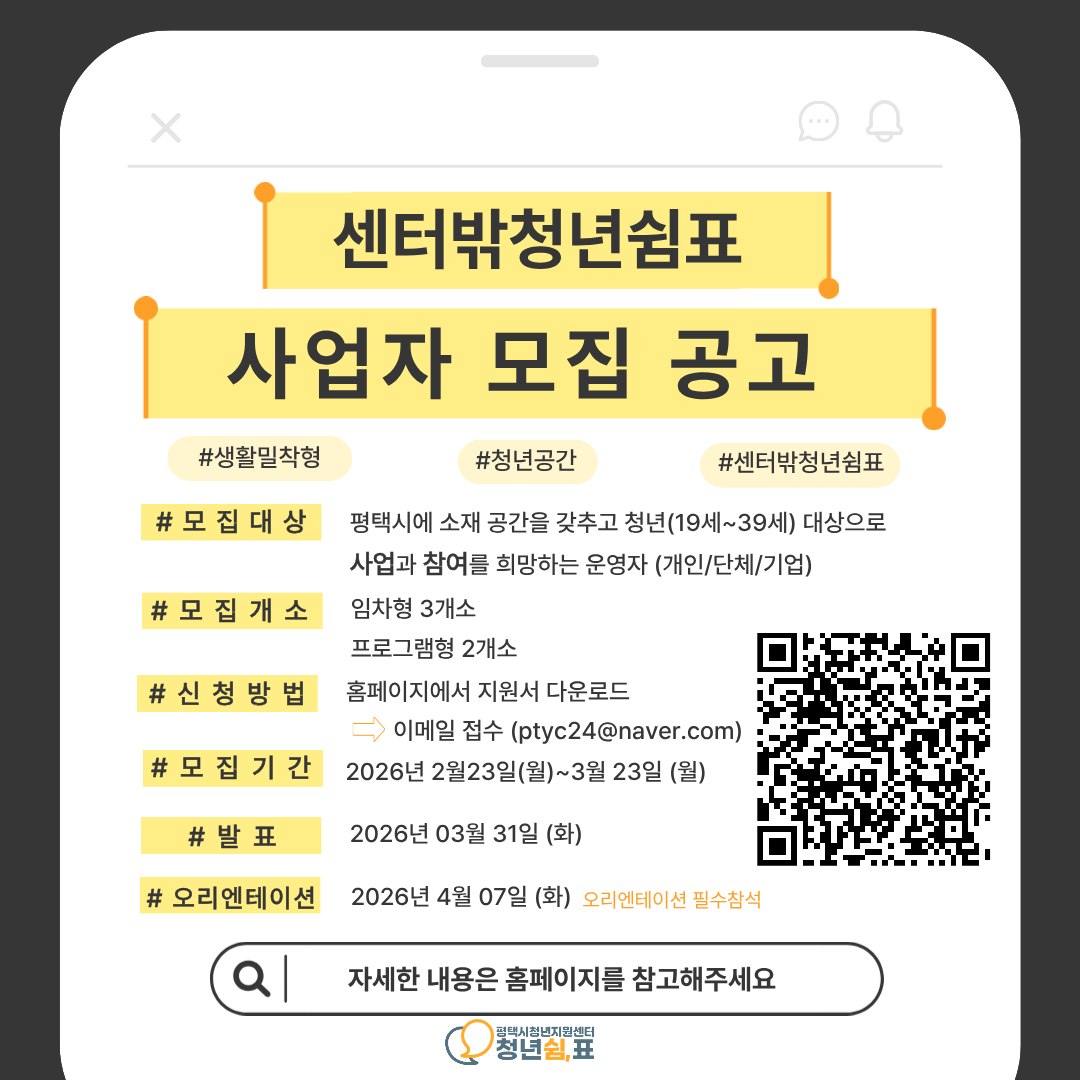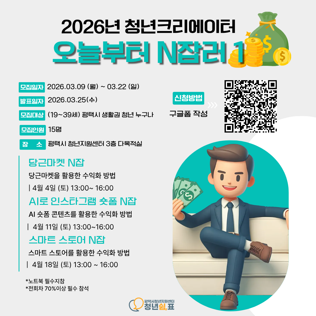 ㅁ 2026 청년 크리에이터 「오늘부터 N잡러」 참여자 모집 ㅁ 온라인 플랫폼을 활용한 다양한 N잡 수익화 방법을 배우고직접 콘텐츠를 제작해보는 청년 크리에이터 교육 프로그램입니다.당근마켓, AI 숏폼 콘텐츠, 스마트스토어 등실제 활용 가능한 플랫폼을 통해 콘텐츠 기획부터 업로드까지 직접 경험해볼 수 있습니다.N잡과 온라인 콘텐츠 활동에 관심 있는 청년들의 많은 참여 바랍니다. ✔ 모집기간2026.03.09(월) ~ 03.22(일) ✔ 교육일정• 04.04(토) 당근마켓 N잡• 04.11(토) AI 숏폼 콘텐츠 N잡• 04.18(토) 스마트스토어 N잡- 13:00 ~ 16:00 ✔ 모집대상19~39세 평택시 생활권 청년 ✔ 모집인원15명 ✔ 장소평택시 청년지원센터 청년쉼,표 (3층 다목적실) ✔ 신청방법평택시 청년지원센터 홈페이지 → 구글폼 신청※ 노트북 필수 지참※ 전체 교육 일정의 70% 이상 참여 필수 - 문의 : 평택시 청년지원센터 청년쉼,표