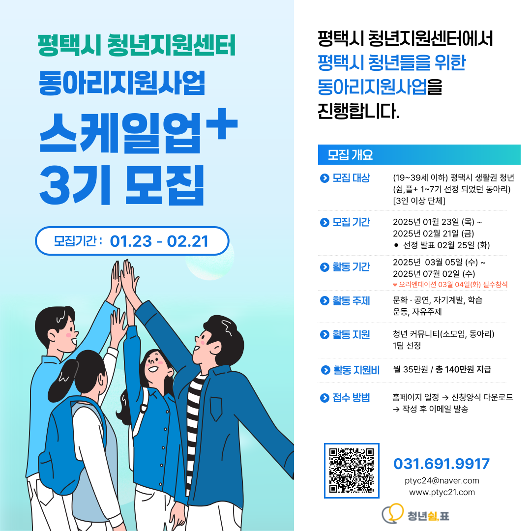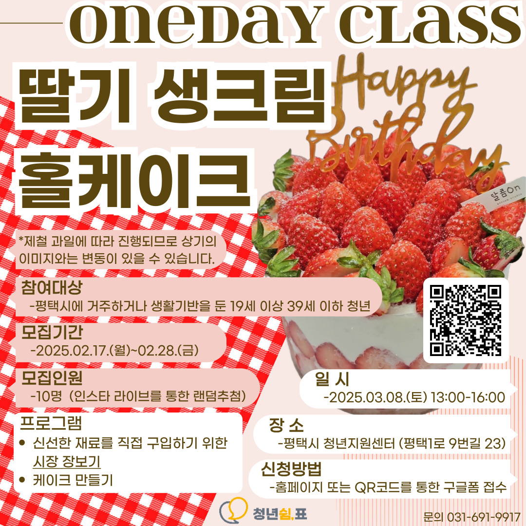 2025 평택시청년지원센터 [원데이클래스 - 딸기 홀케이크 만들기] 신청자 모집✅ 일시 - 클래스 일정: 2025.03.08.(토) 13:00~16:00 - 발표일 : 2025.03.04.(화) 15:00✅ 내용 : 통복시장에서 딸기 구매 후 센터로 복귀하여 딸기 생크림 홀케이크 만들기✅ 참여대상 : 평택시에 거주하거나 생활기반을 둔 19세 이상 39세 이하 청년✅ 장소 : 통복시장 & 평택시 청년쉼,표 3층 공유부엌 (평택1로 9번길 23/ 평택역 도보 3분)✅ 모집기간 : 2025.02.17.(월) ~ 2025.02.28.(금) 프로그램이 종료된 것은 신청하셔도 접수되지 않습니다.✨✅ 모집인원 : 10명 - 선정 방법은 랜덤 추첨으로 진행 됩니다. 공정성을 위하여 인스타 라이브 방송 진행예정입니다. - 취소자 발생 시 신청 기준; 우선 신청자순으로 연락 예정 ✅ 비용 : 무료<안내사항>- 원활한 프로그램 안내 및 공지사항 전달을 위해 연락처를 정확하게 기입해주세요. (연락처나 이름 등 개인정보를 제대로 입력하지 않을 경우 신청이 취소될 수 있습니다)- 신청 후 불참 시 추후 청년쉼,표에서 진행하는 프로그램 수강이 어려울 수 있습니다.☎문의사항 : 031-691-9917 (평택시 청년지원센터 청년쉼,표)