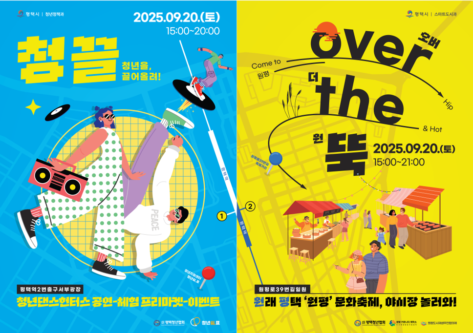 평택역 2번출구, 원평동에서 '청년의 날'과 '도시재생' 연합 축제가 함께 개최됩니다.<청년의 날 행사 안내> 2025 제4회 평택시 청년의 날 <청끌> - 청년, 끌어올려! ????한 해에 단 하루! 청년들이 주인공이 되는 특별한 날이 돌아왔습니다.올해 청년의 날은 평택역 2번 출구 서부광장이 청년들의 무대이자 놀이터로 변신합니다.1. 일시 : 2025년 9월 20일(토) 15:00~20:002. 장소 : 평택역 2번 출구 서부광장메인 프로그램 - 청년댄스헌터스개성과 열정이 폭발하는 청년 댄스 배틀!화려한 퍼포먼스와 강렬한 무대 매너로청년들의 에너지를 온몸으로 느껴보세요.청년 프리마켓 & 체험 부스손으로 만든 감성 굿즈와 청년 사장님들의 아이디어 상품,누구나 즐길 수 있는 특별한 체험이 기다립니다. 청년의 날은 단순한 축제가 아닙니다.서로의 꿈과 열정을 끌어올리는 청년들의 축제,올해 9월 20일, 평택역 2번 출구 서부광장에서 마음껏 즐겨보세요!<오버더 뚝 행사 안내>제2회 2025 원평 문화축제 <오버더뚝> 골목이 열리는 순간, 축제가 시작됩니다!1. 일시 : 2025년 9월 20일(토) 15:00~21:002. 장소 : 원평로 39번길 일원 (평택역 2번 출구 청년의날 행사 도보1분)향긋한 먹거리 향이 가득한 골목 야시장,거리 곳곳에서 울려 퍼지는 버스킹과 난타 공연,아이부터 어른까지 즐기는 페이스페인팅 체험과 다채로운 현장 이벤트! 평택역 청년의날의 신나는 행사와 플리마켓과 함께,원평로 39번길에서는 뜨끈한 길거리 음식과 화려한 공연이 기다리고 있습니다!지역 주민·상인·청년이 함께 만드는,웃음과 음악이 흐르는 하루.**제2회 원평 문화축제 <오버더뚝>**에서맛보고, 즐기고, 선물같은 하루를 보내세요! ????골목에서 만나는 특별한 하루청년의날과 함께 더 크게, 더 신나게!놓치지 마세요