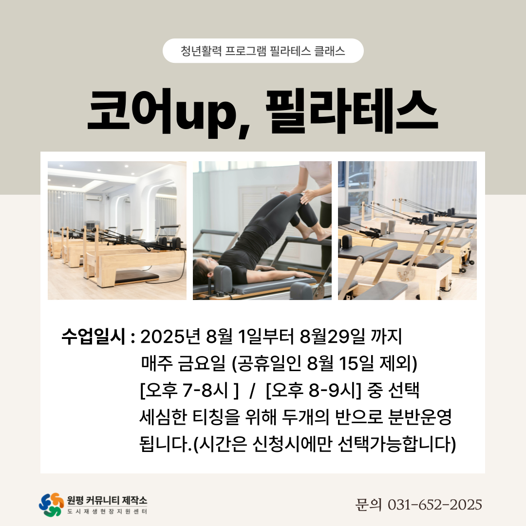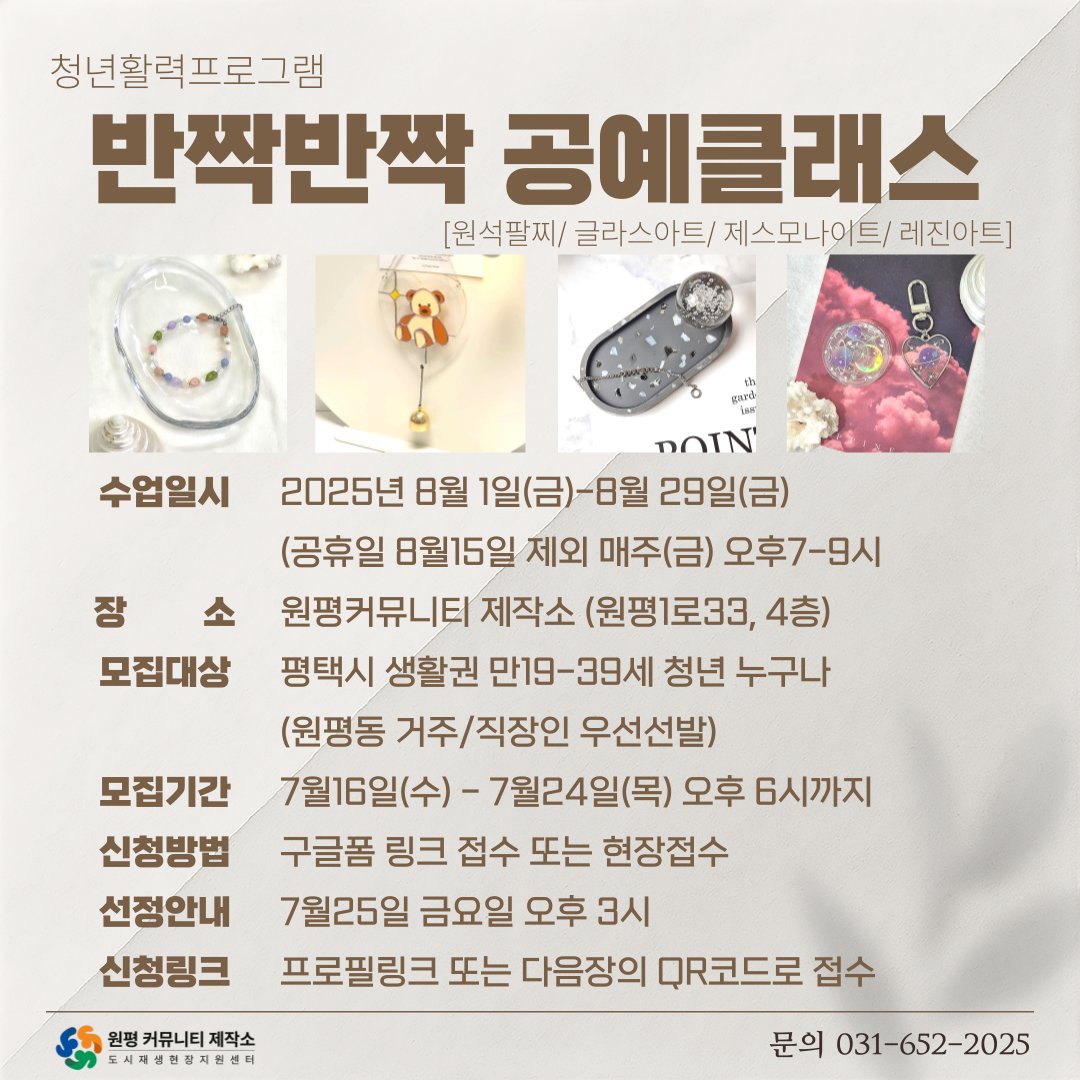 2025 원평 커뮤니티 제작소[반짝반짝 공예수업] 신청자 모집!청년활력 클래스에 오신 것을 환영합니다!이번 반짝반짝 공예수업은다양한 공예를 배워보고 싶다는 설문의견 반영되어원석팔찌, 제스모나이트 트레이, 글라스아트, 레진공예 네가지 수업으로다채롭게 구성되었어요!청년을 위한 공예클래스에 여러분을 초대합니다!# 클래스 일정2025년 8월 1일(금)부터 8월29일(금) 까지 매주 금요일 (공휴일인 8월 15일 제외)시간_ 오후 7:00-9:00총 4주간 진행(4주 모두 참석이 어려우신 경우 다른분께 양보 부탁드립니다.)# 수업 내용원석팔찌, 제스모나이트 트레이, 글라스아트, 레진공예# 참여 대상평택시 생활권 만19-39세 청년 누구나 (원평동 거주/직장인 우선선발)# 장소원평 커뮤니티 제작소(평택시 원평1로 33, 4층 / 평택역 도보 2분 거리)# 모집 인원10명# 모집 기간2025년 7월 16일(수) 9:00부터_ 7월 24일(목) 18:00까지※ 마감 이후 신청은 접수되지 않습니다.# 선정 안내발표일: 2025년 7월 25일(금) 15:00신청자의 거주지, 연령대, 도시재생 연계성에 따라 점수를 산정해 높은점수 순으로 선정됩니다.거주지와 연령대가 해당되지 않아도 신청 가능합니다. (신청불가가 아님, 점수산정을 위한 내용임)취소자 발생 시, 선정기준에 따라 순차 연락 예정# 수강료무료# 신청 링크(월요일 부터 접수 가능한 링크를 프로필 링크로 게시할 예정입니다)# 안내사항정확한 연락처 기입은 필수! (누락 시 신청 취소될 수 있음)무단 불참 시, 향후 원평 커뮤니티 제작소에서 진행하는 프로그램 참여에 제한이 있을 수 있습니다.# 문의평택시 원평 커뮤니티 제작소☎ 031-652-2025