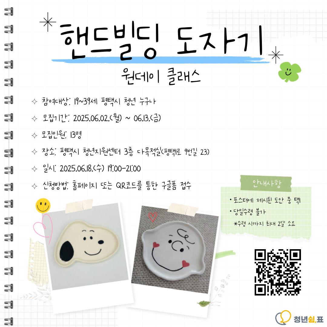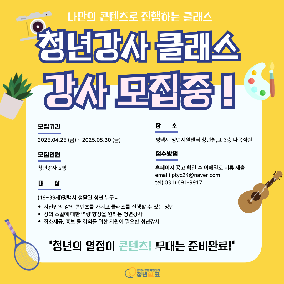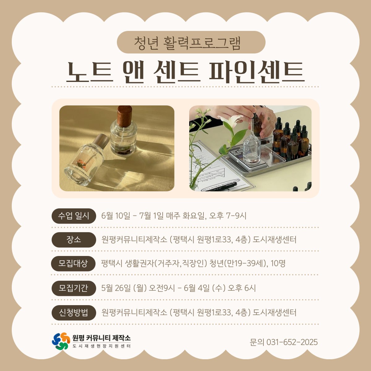 2025 원평 커뮤니티 제작소[노트 앤 센트 파인센트] 신청자 모집!은은한 향기로 채우는 화요일 밤,청년을 위한 조향 클래스에 여러분을 초대합니다!- 클래스 일정2025년 6월 10일(화)부터 7월1일(화) 까지 매주 화요일시간: 19:00 ~ 21:00총 4주간 진행(4주 모두 참석이 어려우신 경우 다른분께 양보 부탁드립니다.)- 수업 내용1주차: 프레쉬/프루티(fresh/fruity) 계열의 향료 시향 및핸드크림 & 롤온제작2주차: 플로럴/머스키(floral/musky) 계열의 향료 시향 및핸드 앤 바디워시 & 천연레진방향제 제작3주차: 우디/발삼(woody/balsam) 계열의 향료시향 및룸스프레이와 테라리움 or 스머지스틱 제작4주차: 다루었던 모든 향료를 활용하여 나만의 향수 만들기- 참여 대상평택시 생활권 만 19-39세 청년 누구나(원평동 거주/직장인 우선선발)- 원평 커뮤니티 제작소(평택시 원평1로 33, 4층 / 평택역 도보 2분 거리)- 모집 인원10명- 모집 기간2025년 5월 26일(월) 9:00부터_6월 4일(수) 18:00까지※ 마감 이후 신청은 접수되지 않습니다.- 선정 안내발표일: 2025년 6월 5일(목) 15:00신청자의 거주지, 연령대, 도시재생 연계성에 따라 점수를 산정해 높은점수 순으로 선정됩니다. 거주지와 연령대가 해당되지 않아도 신청 가능합니다. (신청불가가 아님, 점수산정을 위한 내용임)취소자 발생 시, 선정기준에 따라 순차 연락 예정- 수강료무료- 신청 링크https://docs.google.com/forms/d/1AEBfk_szt8j-PZ5PvlDc-OTBK4HJot50nFmu80YvDrE/edit- 안내사항정확한 연락처 기입은 필수! (누락 시 신청 취소될 수 있음)무단 불참 시, 향후 원평 커뮤니티 제작소에서 진행하는 프로그램 참여에 제한이 있을 수 있습니다.- 문의평택시 원평 커뮤니티 제작소☎ 031-652-2025