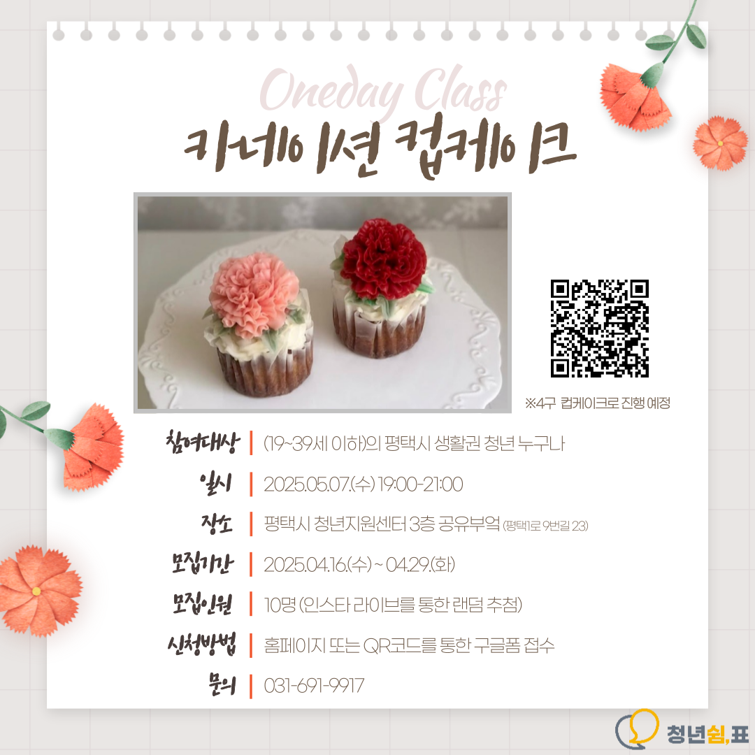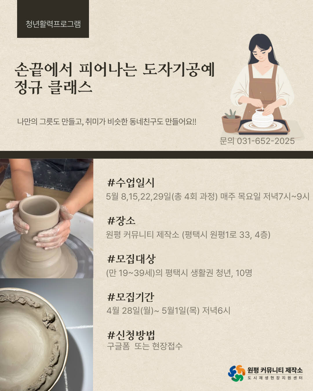 ○ 2025 원평 커뮤니티 제작소[손끝에서 피어나는 도예클래스] 신청자 모집!○ 클래스 일정2025년 5월 8일(목)부터 매주 목요일,(5월8,15,22,29일) 4주간 진행시간: 19:00 ~ 21:00○ 수업 내용1주차: 핀칭기법으로 작은 잔 만들기2주차: 코일링 기법으로 머그컵 만들기3주차: 판성형 기법으로 플레이트 만들기4주차: 청화기법으로 나만의 커피잔 디자인하기○ 참여 대상평택시 생활권 청년(만19-39세) 누구나 (원평동 생활권자 및 도시재생 프로그램 연계자 우선선발)○ 장소원평 커뮤니티 제작소(평택시 원평1로 33, 4층 / 평택역 도보 2분 거리)○ 모집 인원10명○ 모집 기간2025년 4월 28일(월) 9:00부터 5월 1일(목) 18:00까지※ 마감 이후 신청은 접수되지 않습니다.○ 선정 안내발표일: 2025년 5월 2일(금) 15:00신청자의 거주지, 연령대, 도시재생 연계성에 따라 점수를 산정해 높은점수 순으로 선정됩니다. ○ 수강료 : 무료○ 신청 링크https://docs.google.com/forms/d/1vKh1fy59ayRZ3t3rgY-W8AqWdY95V6FckIQEzlP70y4/edit○ 안내사항무단 불참 시, 향후 원평 커뮤니티 제작소에서 진행하는 프로그램 참여에 제한이 있을 수 있습니다.○ 문의평택시 원평 커뮤니티 제작소☎ 031-652-2025