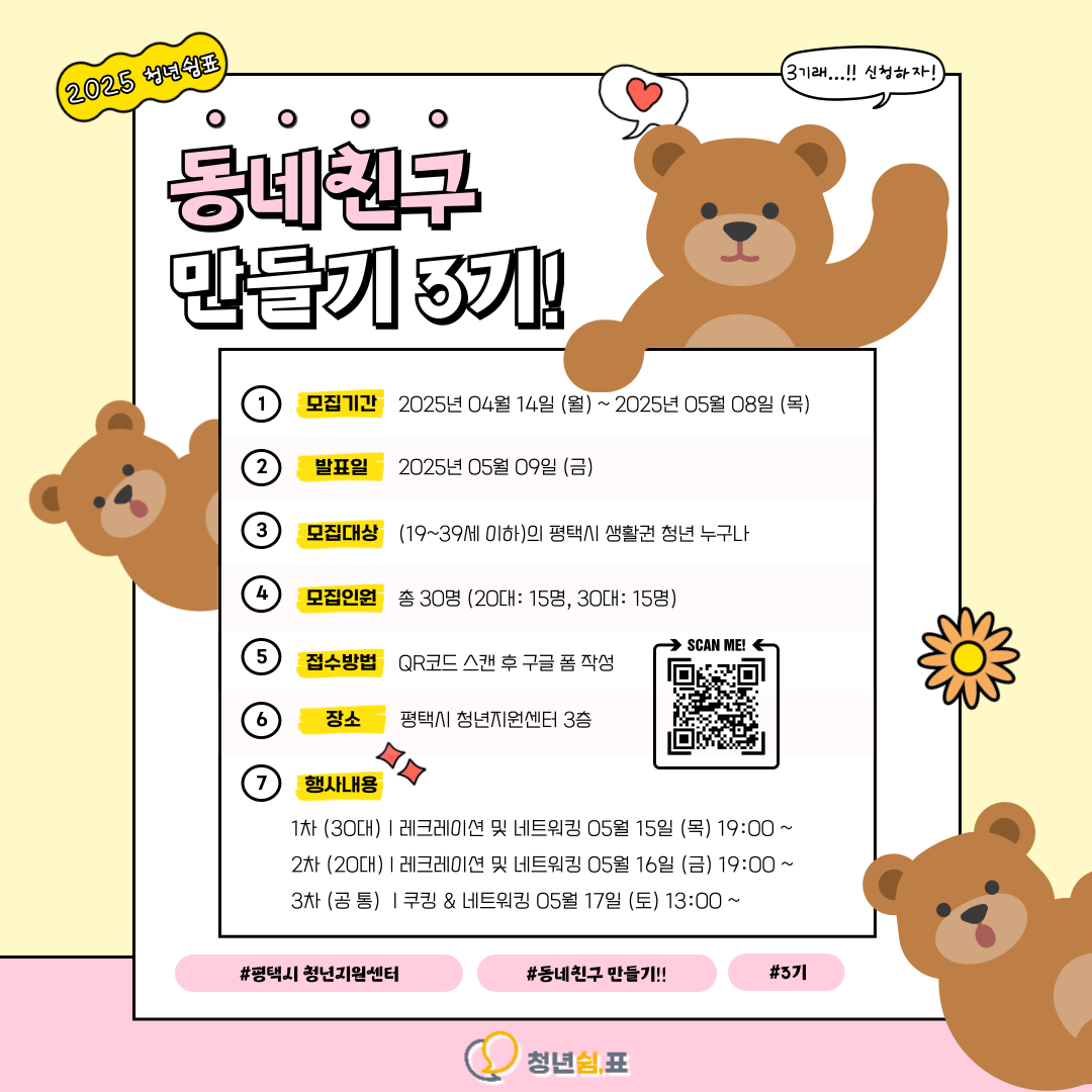 2025년 [동네친구 만들기] - 3기 일시 (쿠킹 & 네트워킹 데이 필수 참석) - 30대 : 2025.05.15.(목) 19:00~22:00 - 20대 : 2025.05.16.(금) 19:00~22:00 - 쿠킹 & 네트워킹 데이 : 2025.05.17.(토) 13:00~16:00참여대상 : (19~39세 이하)의 평택시 생활권 청년 누구나장소 : 평택시 청년쉼,표 3층 다목적실, 공유부엌 (평택1로 9번길 23/ 평택역 도보 3분)모집기간 : 2025. 04. 14(월) ~ 2025. 05. 08(목)✅ 프로그램이 종료된 것은 신청하셔도 접수되지 않습니다 ✅모집방법 : 구글 폼 접수 (URL: https://forms.gle/bBfCHwZBJmvtaoJFA)선정 결과 발표 : 2025.05.09 (금)모집인원 : 30명 - (20대 15명, 30대 15명) (신청한 자료를 기준으로 성실도 평가하여 선정 예정)비용 : 무료 <안내사항>- 원활한 프로그램 안내 및 공지사항 전달을 위해 연락처를 정확하게 기입해주세요. (연락처나 이름 등 개인정보를 제대로 입력하지 않을 경우 신청이 취소될 수 있습니다) - 신청 후 불참 시 추후 청년쉼,표에서 진행하는 프로그램 수강이 어려울 수 있습니다.** 동네친구 만들기 사업 참가자 선정 시, 지원서 작성의 성실성을 중점적으로 평가합니다. 지원 동기, 참여 계획, 관련 경험을 구체적이고 진정성 있게 작성한 지원자를 우대합니다. **☎문의사항 : 031-691-9917 (평택시 청년지원센터 청년쉼,표)